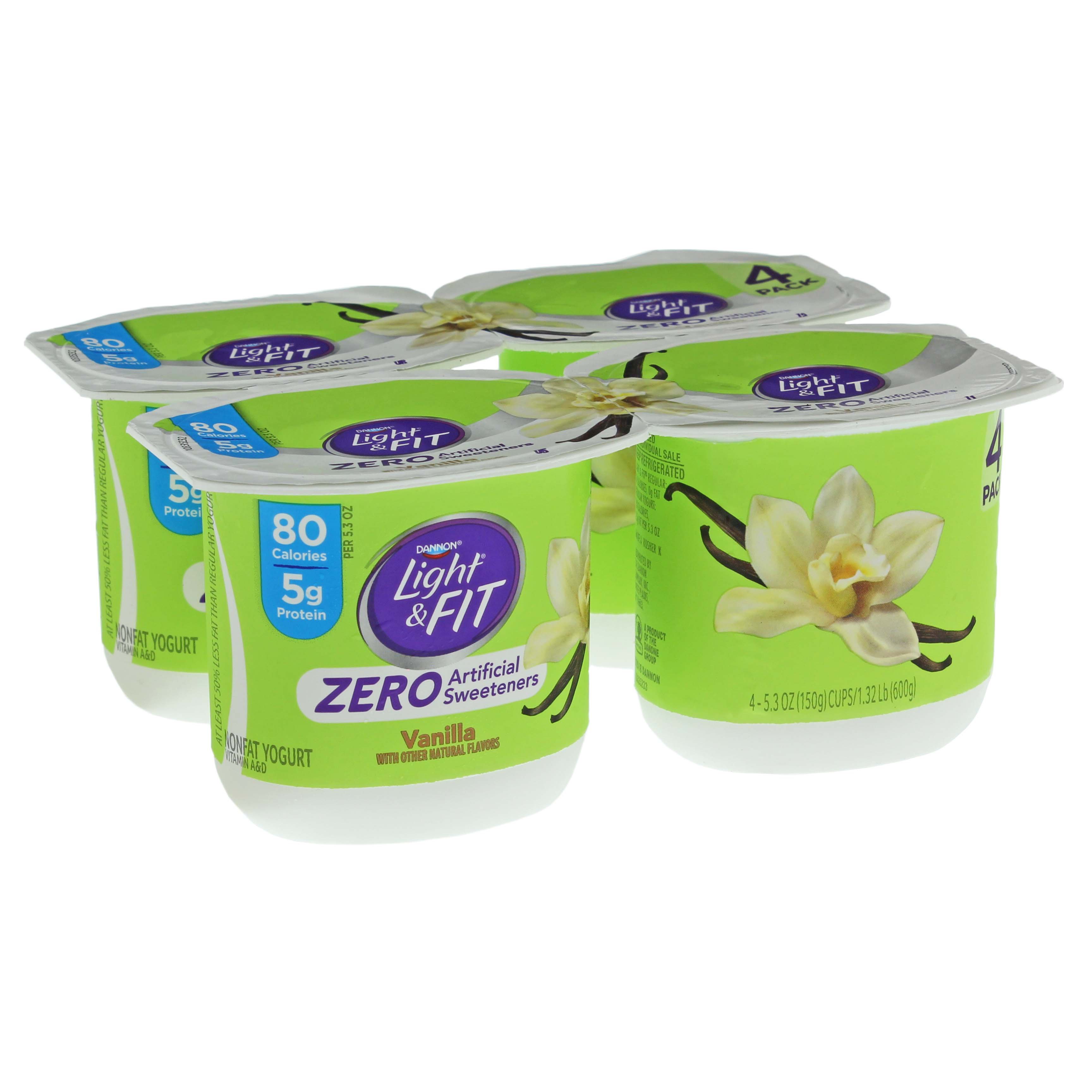 Light Fit Vanilla Yogurt. Each cup of Dannon Light Fit nonfat yogurt has 0 fat and 70 calories per 53-oz. Light Fit Vanilla Yogurt.